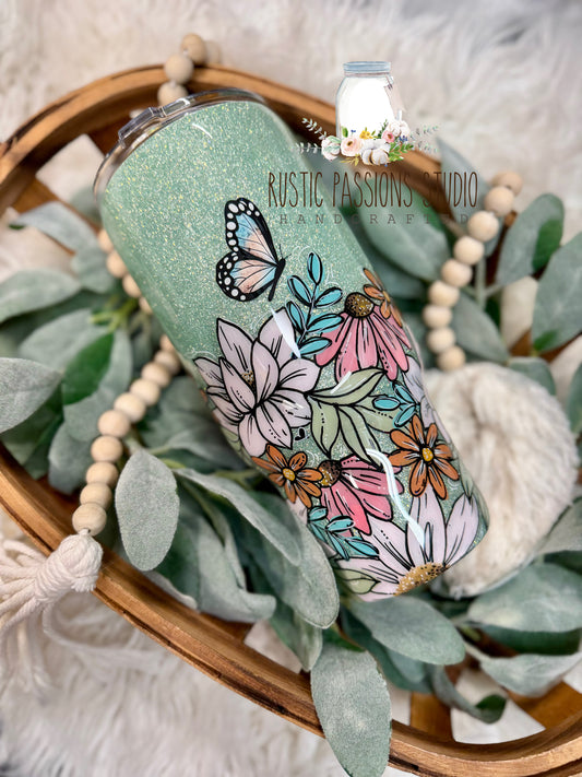 Bee and Wildflower Hand painted 40 oz Handled glitter tumbler