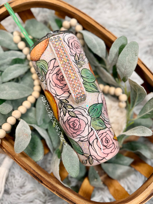 24 oz curve Hand painted floral peach and rhinestones handled tumbler