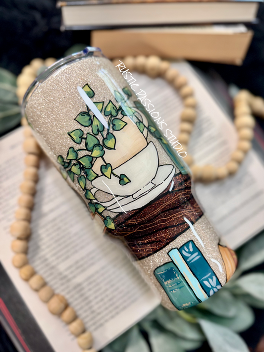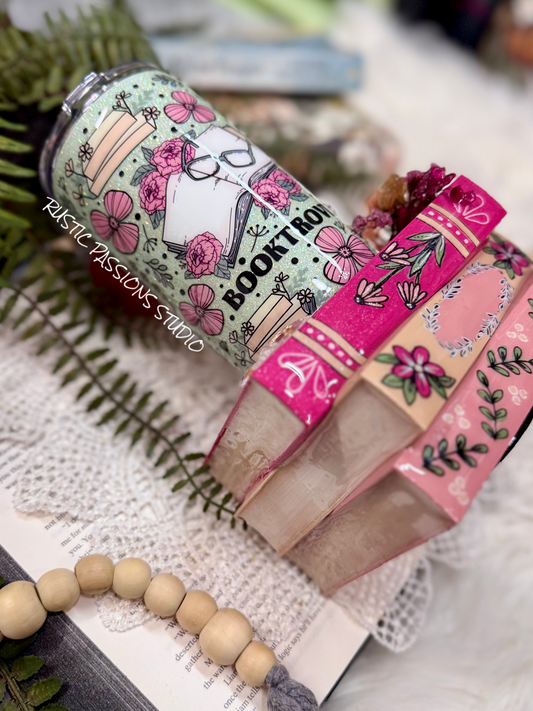 24 oz - 3D Floral Book Tumbler with Hand Painted Books