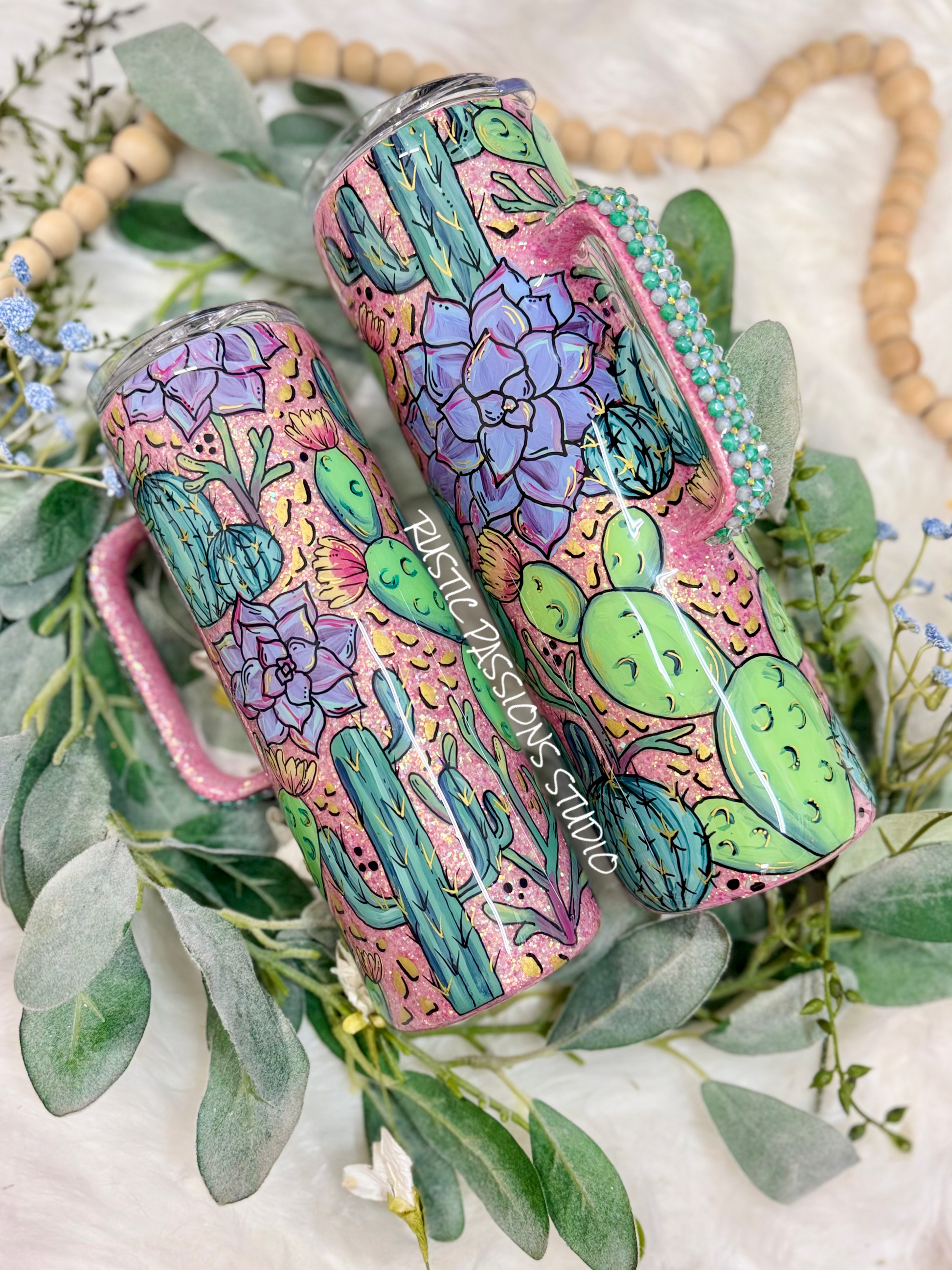 20 oz Hand painted succulent/cactus Tumbler and Rhinestone Handle