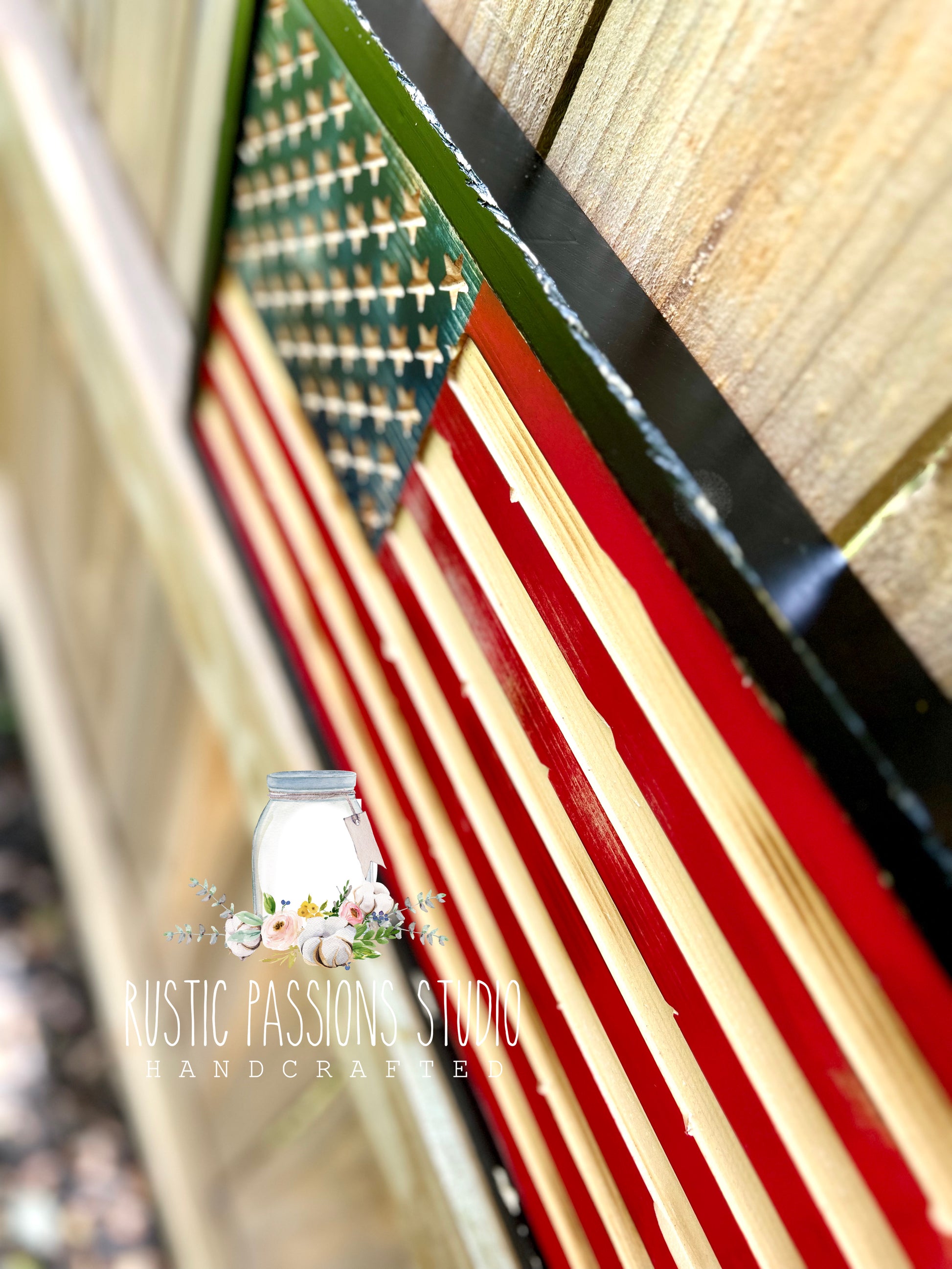 Display your pride and rustic passion all in one with this pine Rustic/worn red, white, and blue US Flag that is surrounded with a black rustic frame. The flag has two key holes routed into the back in order to provide secure mounting. Everything is custom made in house. The flag comes fully stained and painted and coated with a clear satin finish.