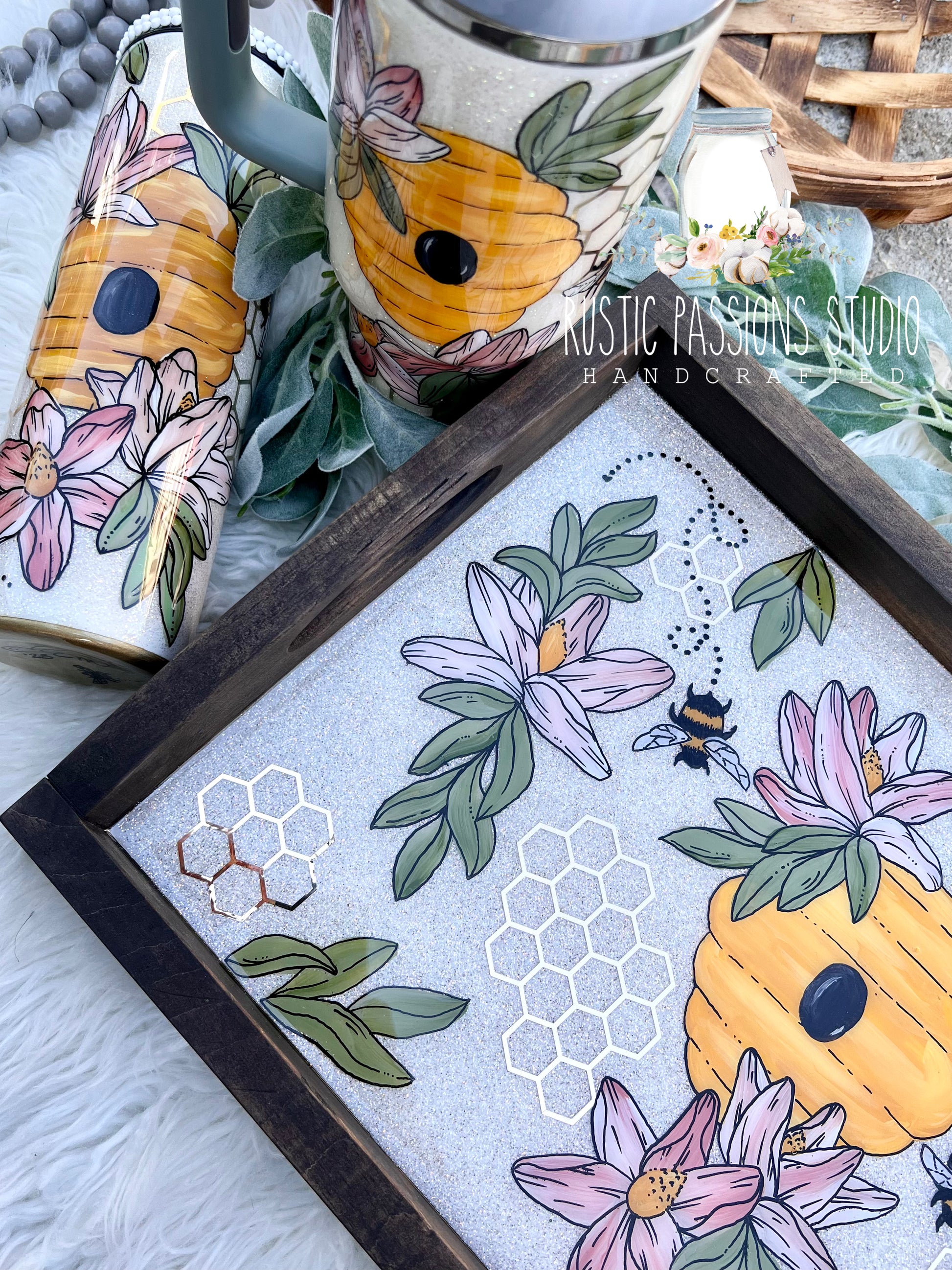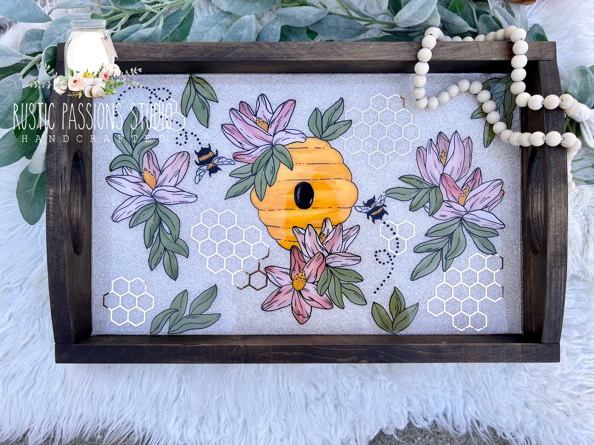 This beautiful, large serving tray is a handmade with a hand painted floral design and sealed with resin. Made with pine and stained a dark brown.