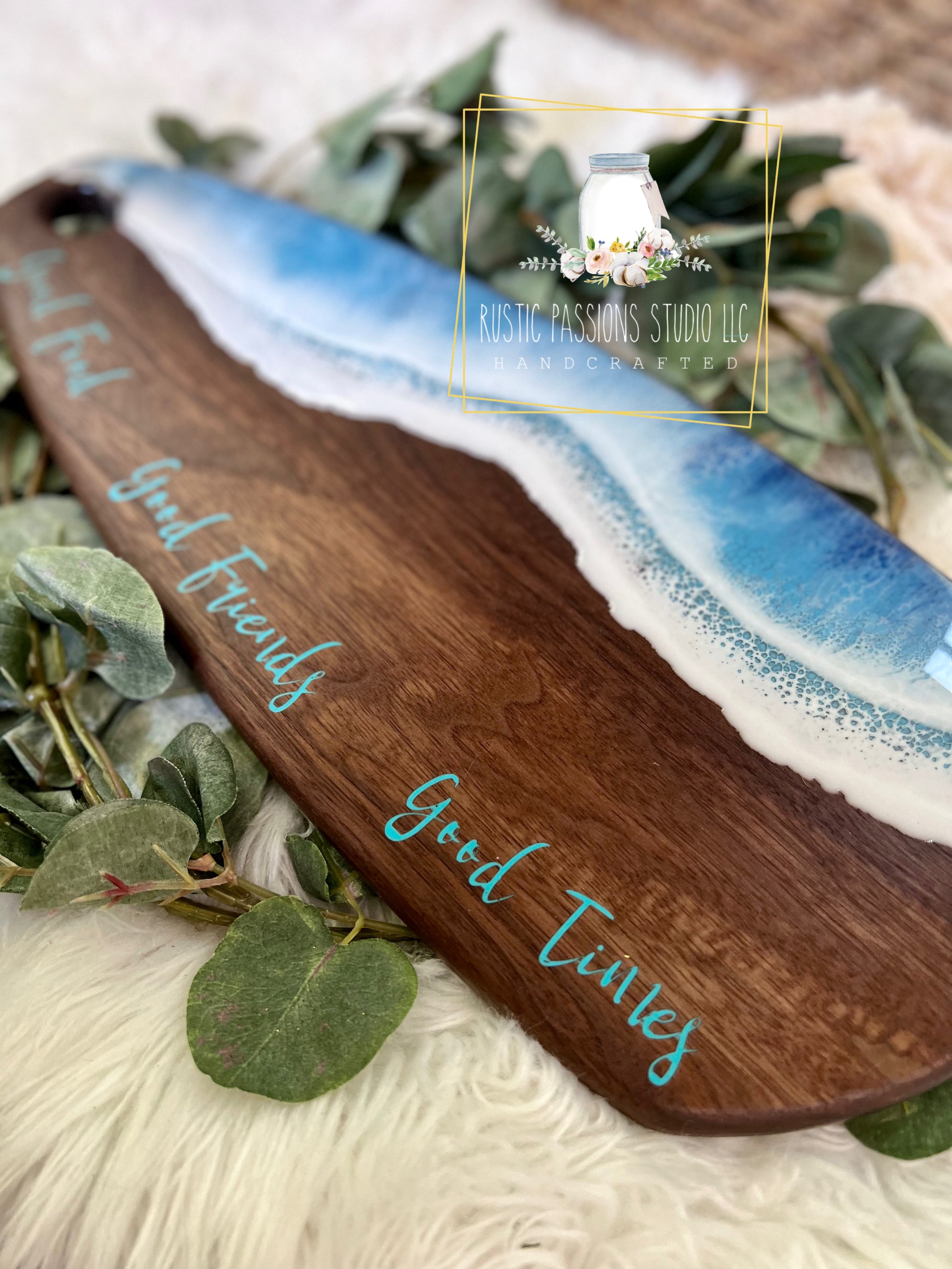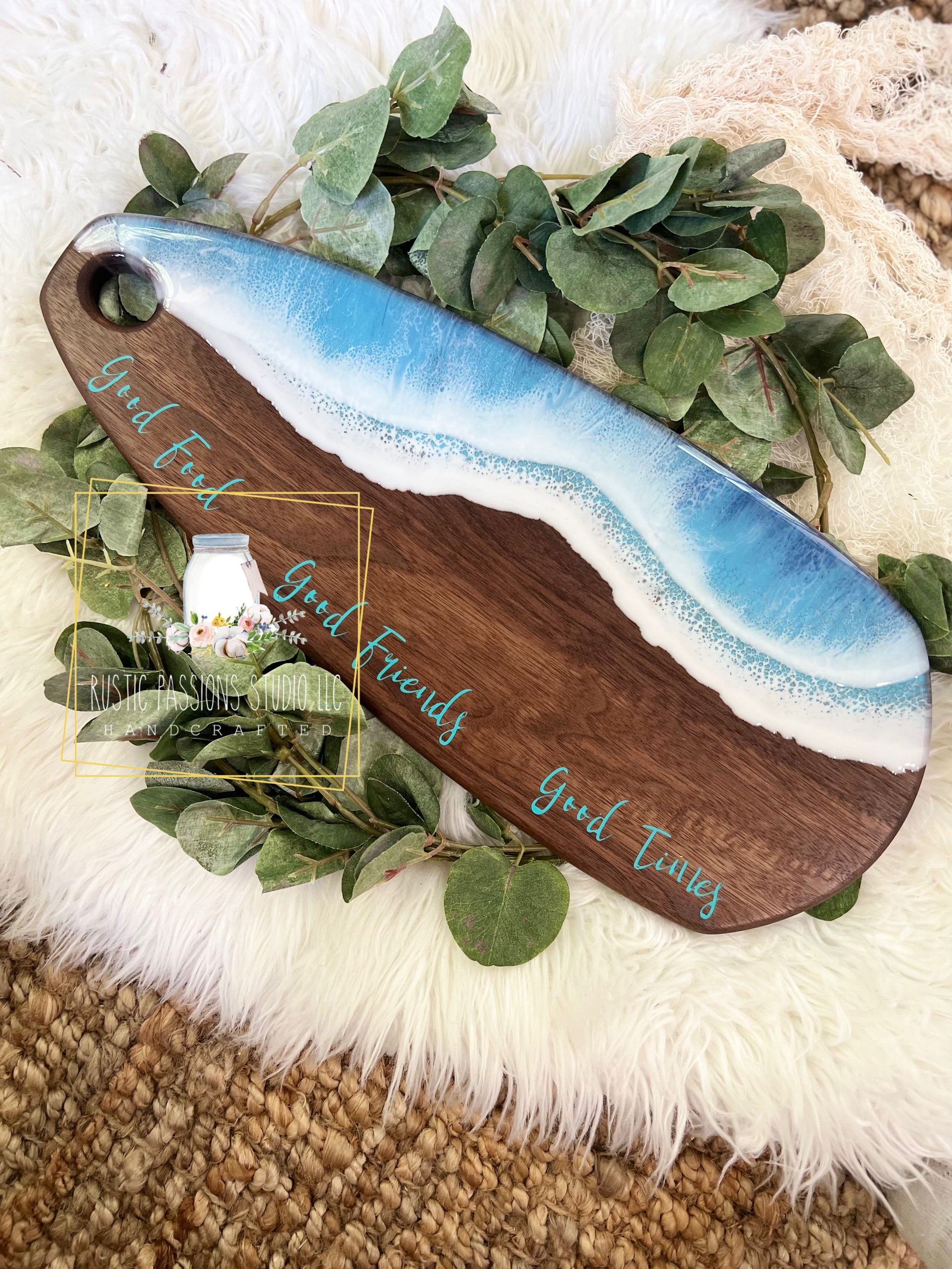 This board in the photos is the exact board you will receive. It is made of hardwood walnut in a surfboard inspired shape with a circular cutout handle. This resin pour was a multiple layered project and has the words good food, good friends, good times.