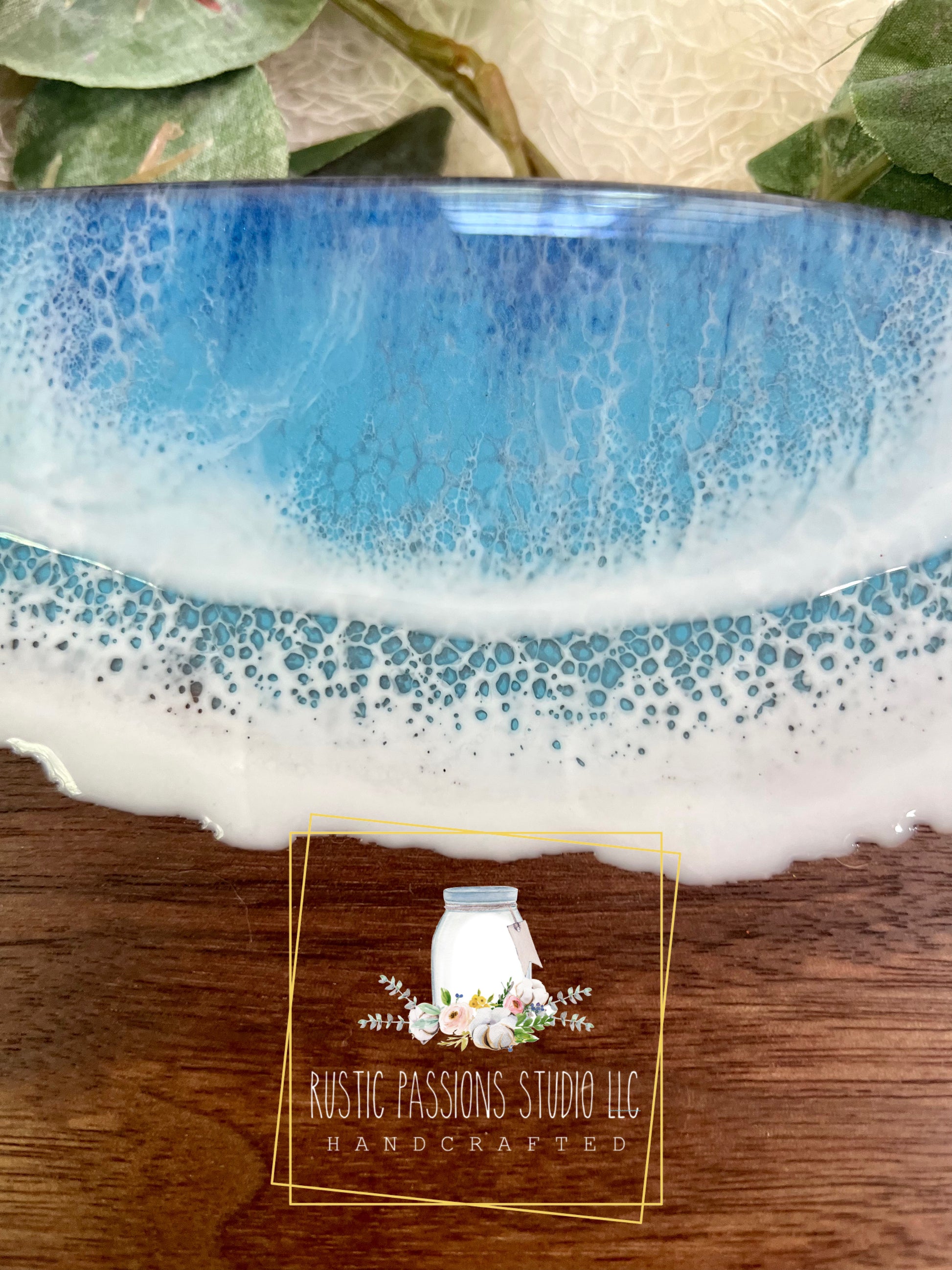 Beautifully handmade charcuterie board with beach inspired resin pour. This board is sure to WOW your guests and be a beautiful accent piece in your home that is also functional.