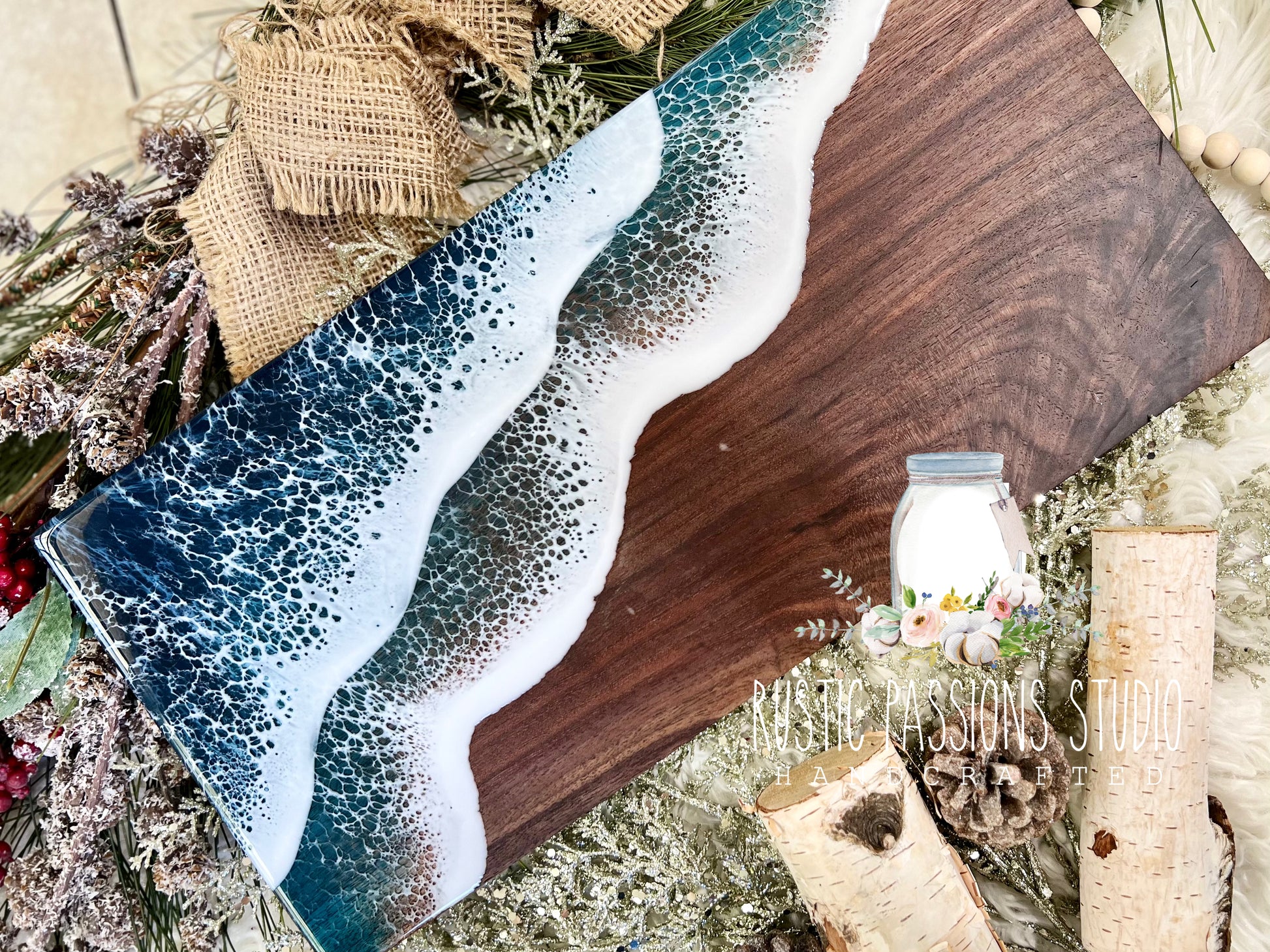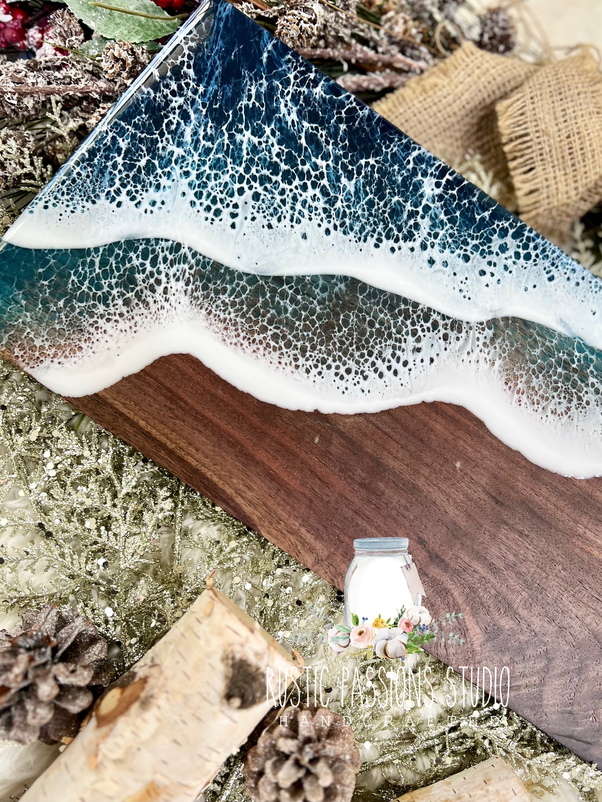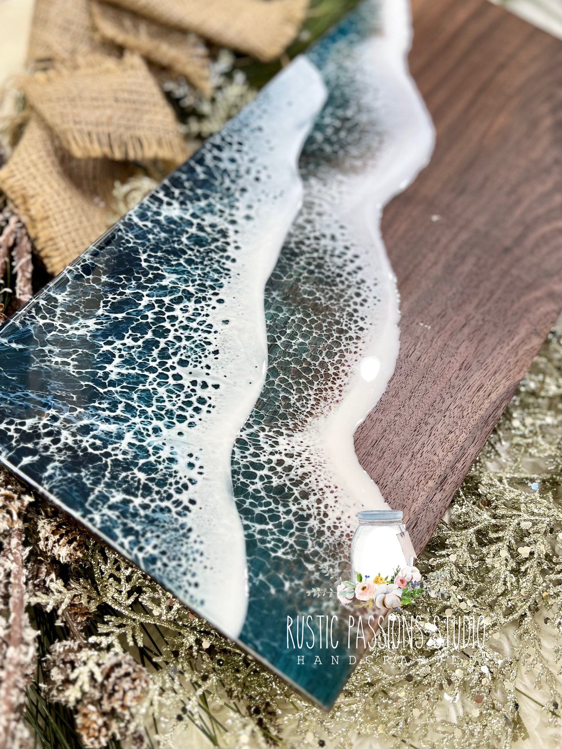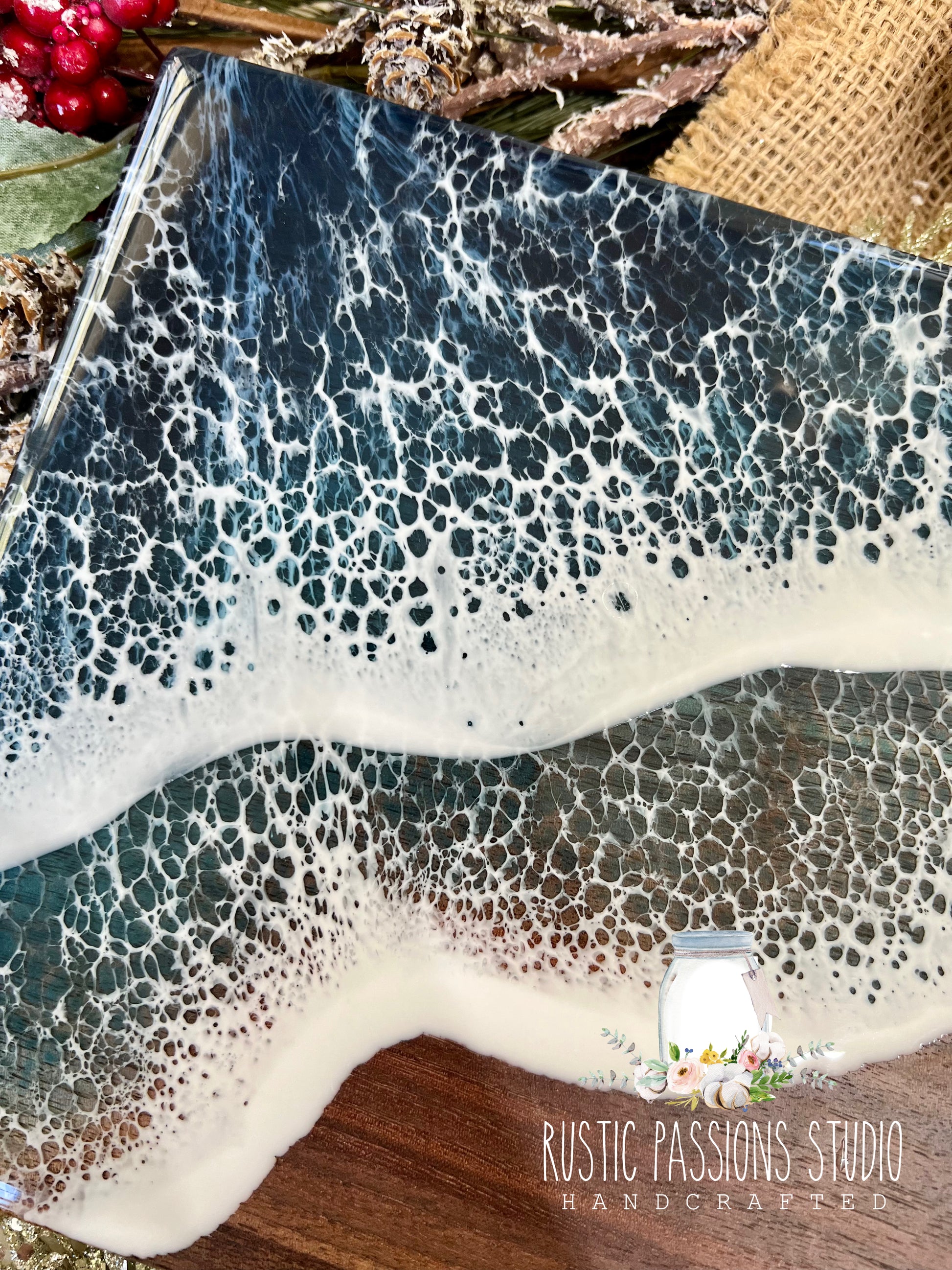 Beautifully handmade charcuterie board with beach inspired resin pour. This board is sure to WOW your guests and be a beautiful accent piece in your home that is also functional.