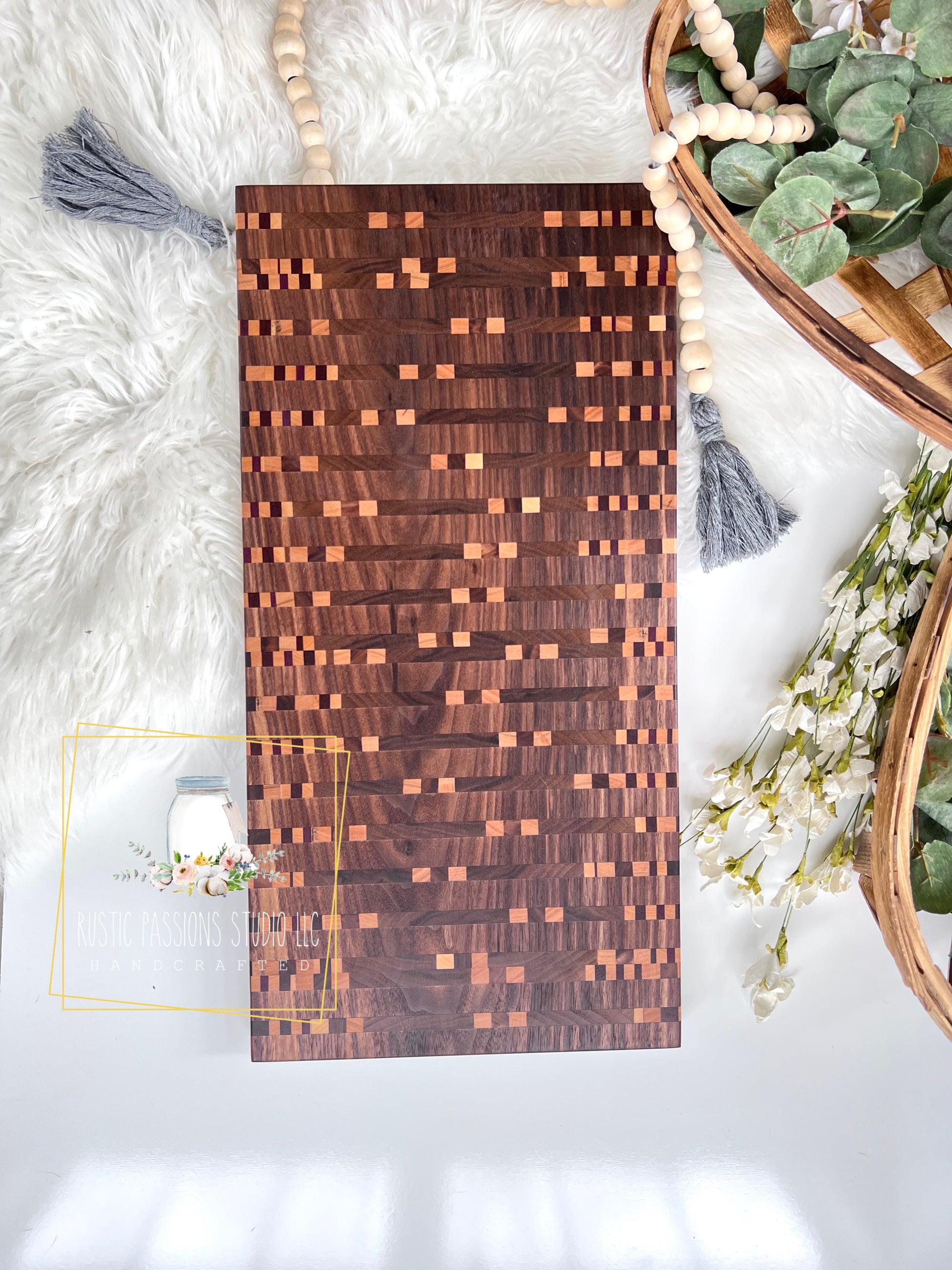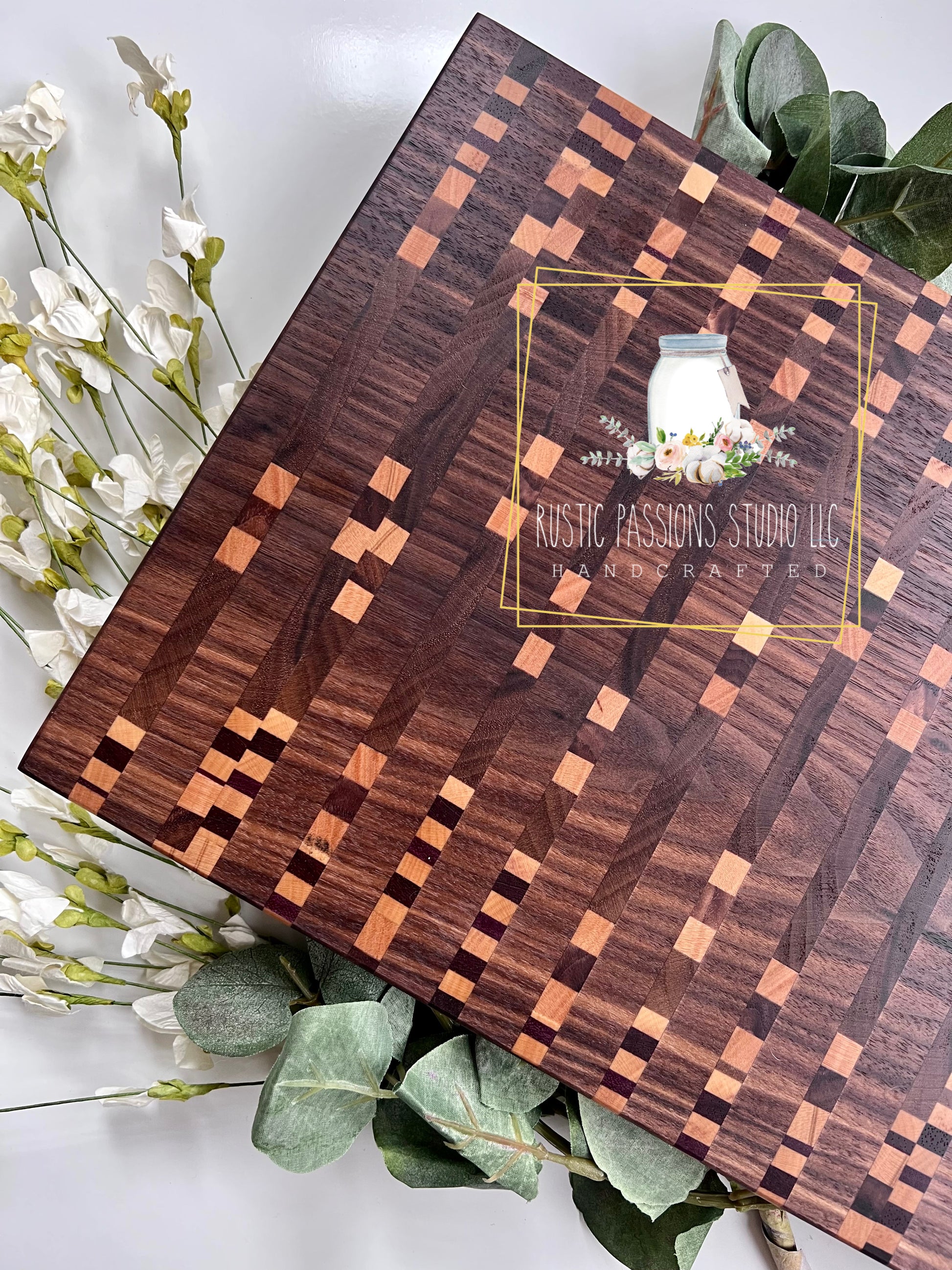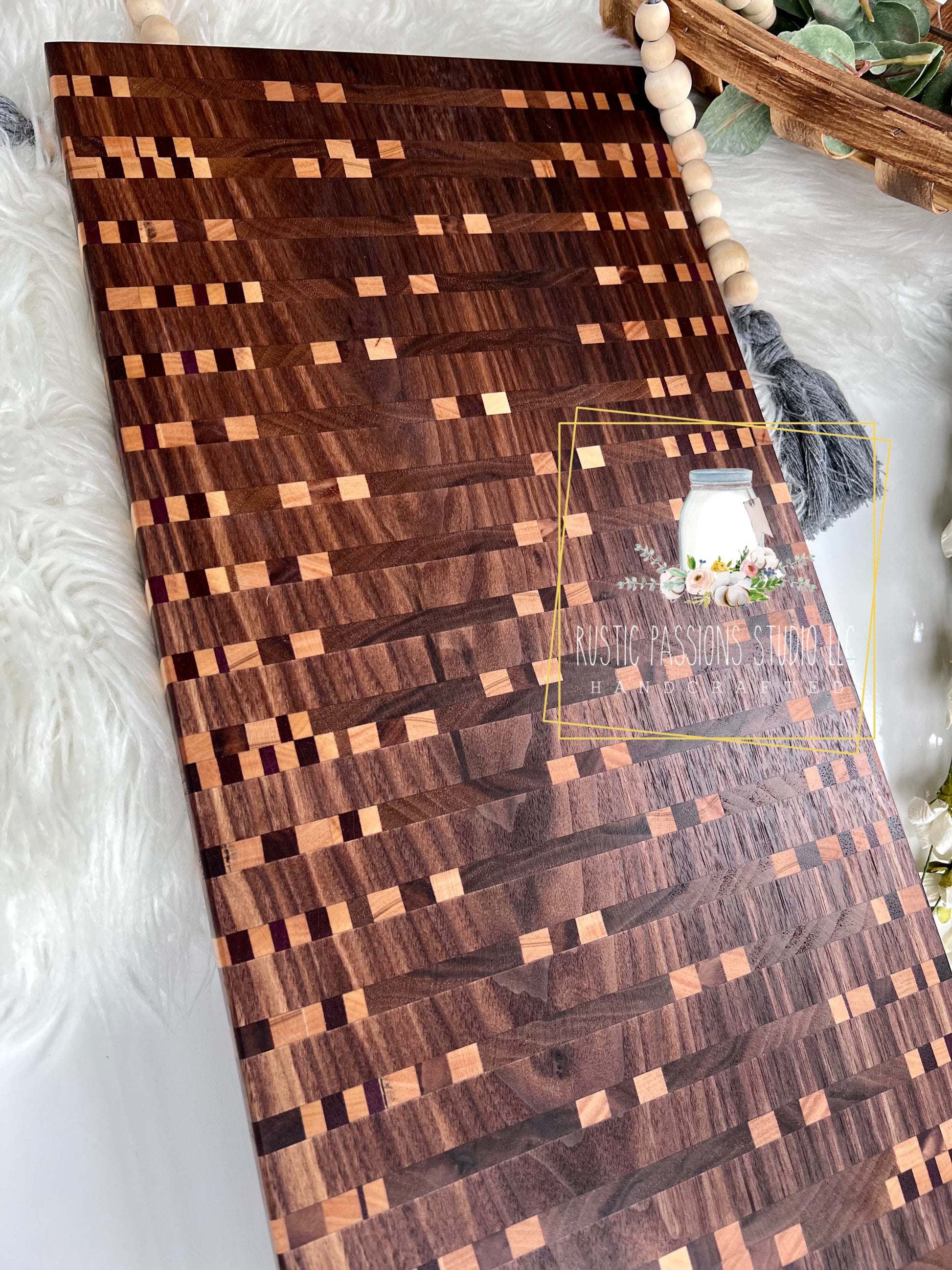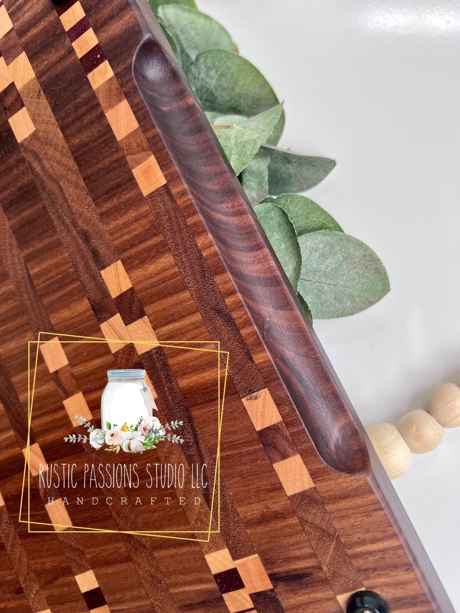 This hardwood cutting board is completely handmade by us. We design the shape and layout of the board in house, choose the wood varieties and colors we like, cut them, glue them up, and then make the finishing touches and details to make each board different and unique. This board is easy to pick up and handle when laying on a flat surface with its grooved handles and feet.